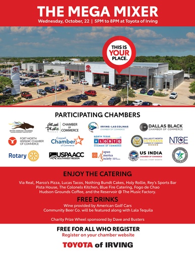 We're thrilled to invite you to the Mega Mixer, an exclusive event brought to you by Toyota of Irving, and supported by 14 organizations across Dallas-Fort Worth, including your FWHCC!